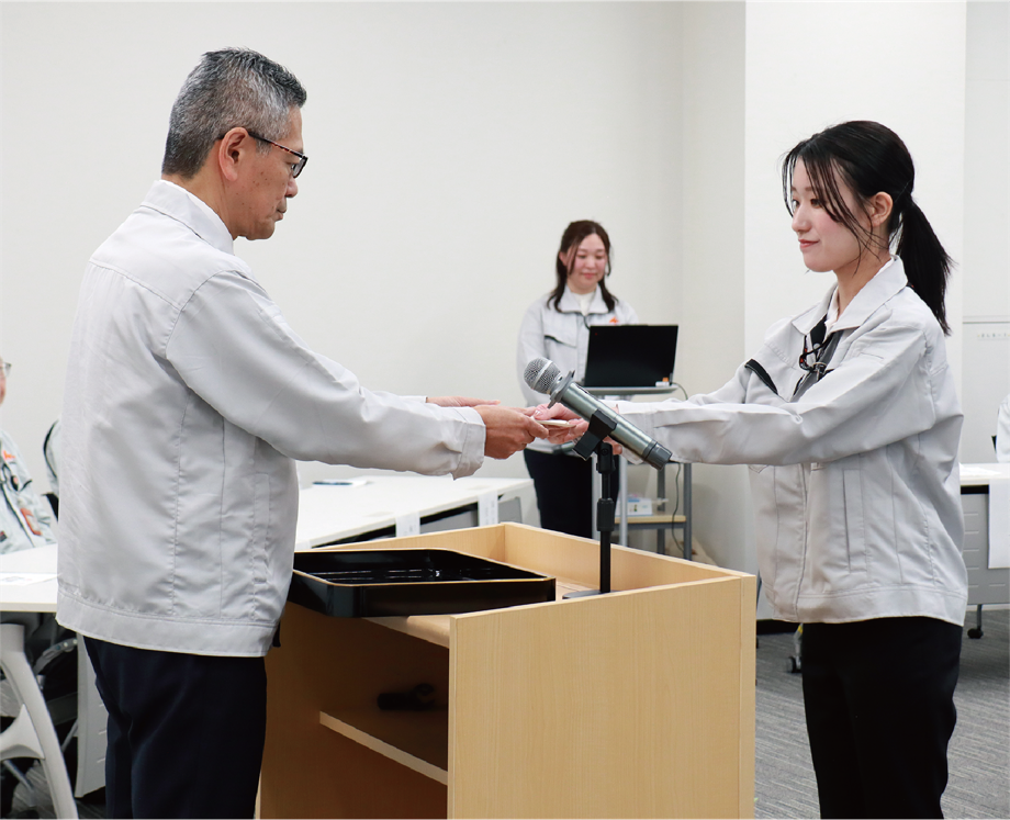 入社式では、社長の江里さんやトヨタ自動車(株)生産本部副本部長 中村さんからの温かな歓迎の言葉に、緊張した面持ちで耳を傾ける姿が印象的でした。新入社員代表の力強い挨拶に続き、一人ひとりが新社会人としての抱負を語り、決意を新たにする場となりました。