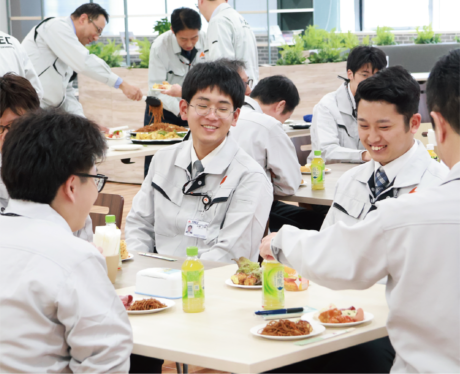 また、本社・福岡技術センターのT- LOUNGEで行われた歓迎懇親会では、食事を囲みながら部署を超えた交流が広がり、次第に緊張もほぐれて、笑顔あふれる和やかなひとときとなりました。